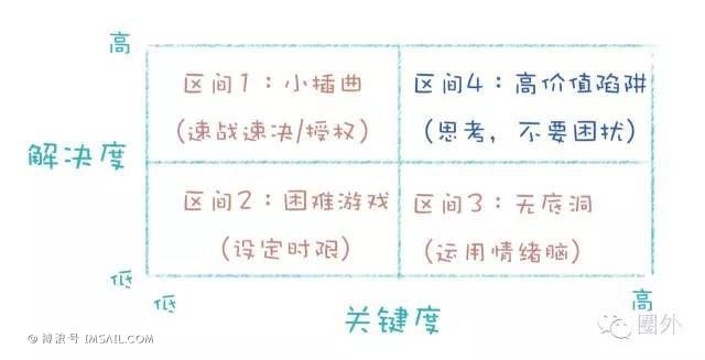第二点,“不是所有真正的问题都值得被解决”——问题很多,当迎面而来时,需要给出优先级,首当其冲的应该是解决最关键、解决度最高的高价值问题。作者把问题按关键度、解决度分为了两个维度(如下图,图片源自“圈外”),提倡优先解决区间4的高价值问题。