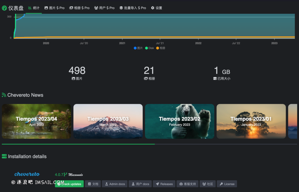 以前网站安装的图床是Chevereto-Free版本,后来开发团队变动停更,就一直用着Chevereto-Free没有升级。前段时间收到v4的邮件,才发现原来chevereto又开始继续更新了。chevereto v4.0也分为免费版和专业版两个版本,因为之前用的是免费版,所以也按照官网的提示,尝试从Chevereto-Free升级到v4.0版本。