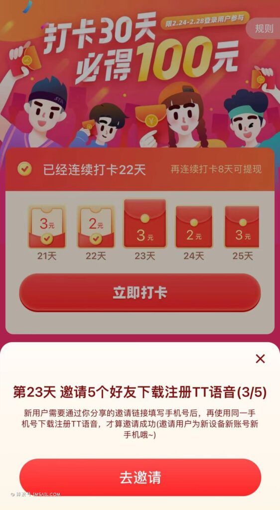 最近,有在参加一个打卡活动:TT语音打卡30天,必得100元。